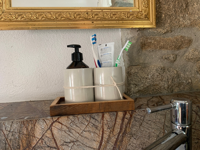 Dieses Set besteht aus einem Zahnputzbecher und einem Seifenspender oder einer schicken Seifenschale und wird durch ein stilvolles Holztableau ergänzt. Dieses dient nicht nur als Ablagefläche, sondern sorgt auch für Ordnung und ein aufgeräumtes Erscheinungsbild.