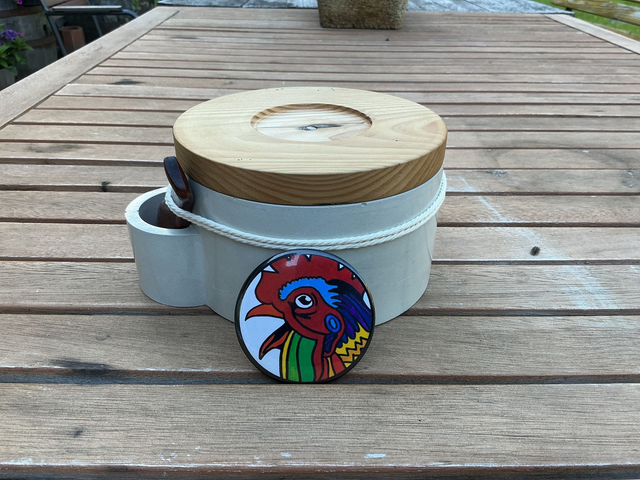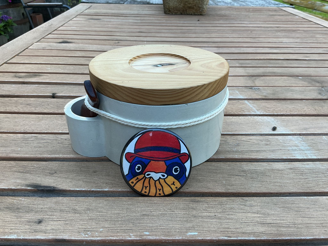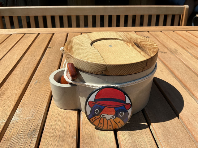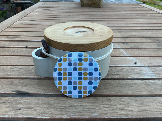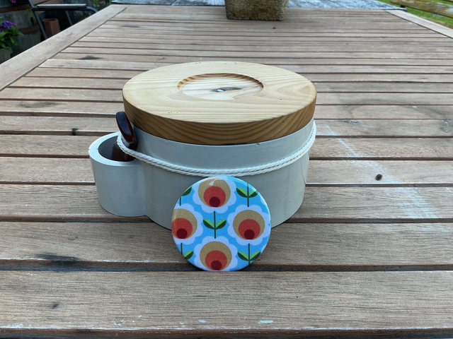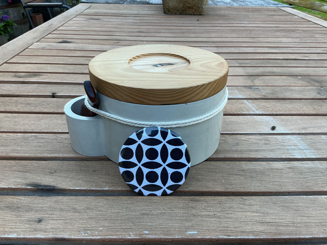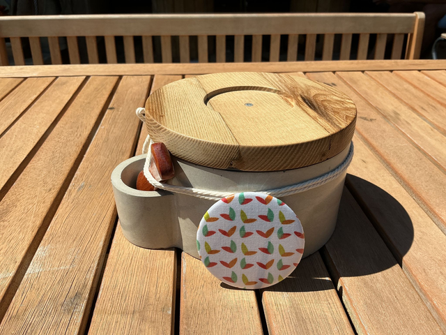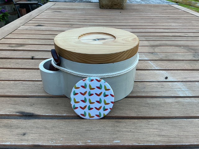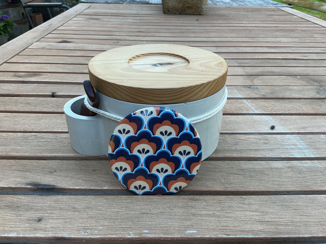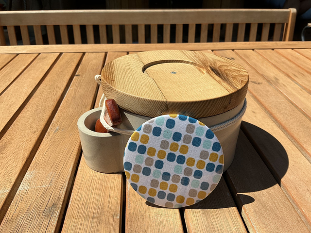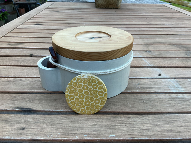 Für die dazugehörigen Deckel verwenden wir verschiedene Holzarten (Altholz), die mit Bienen- oder Hartwachs eingelassen wurde.