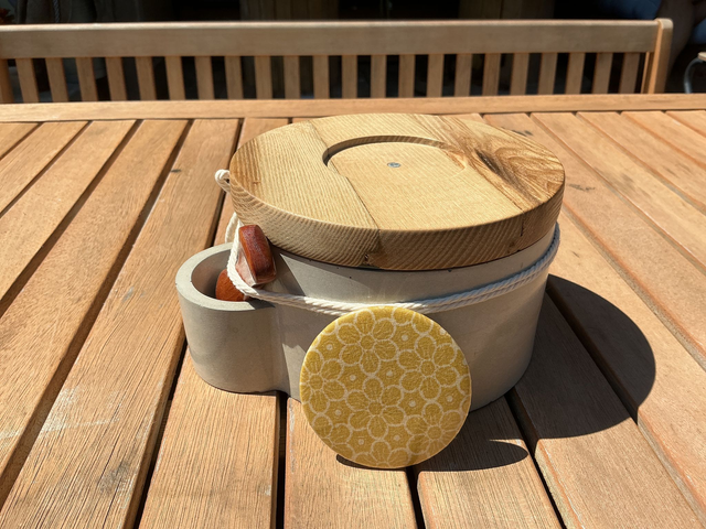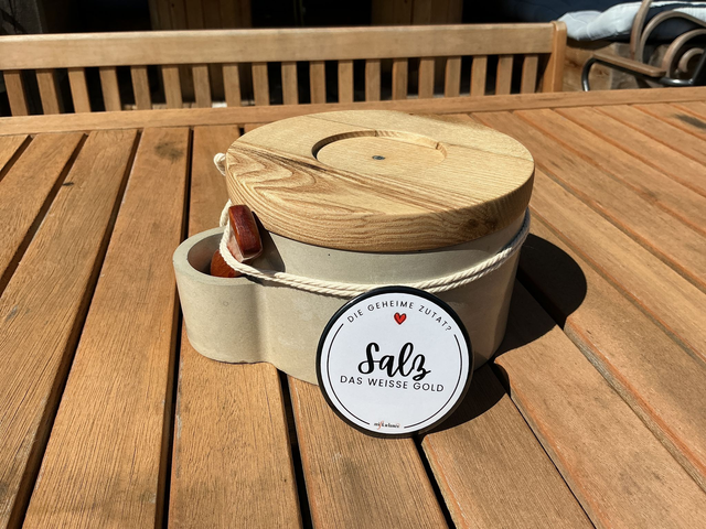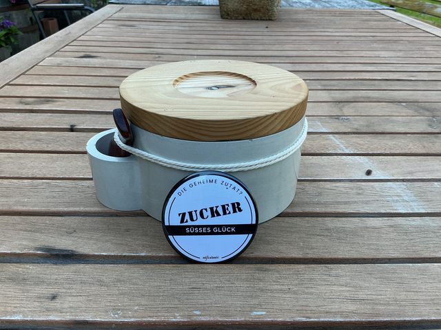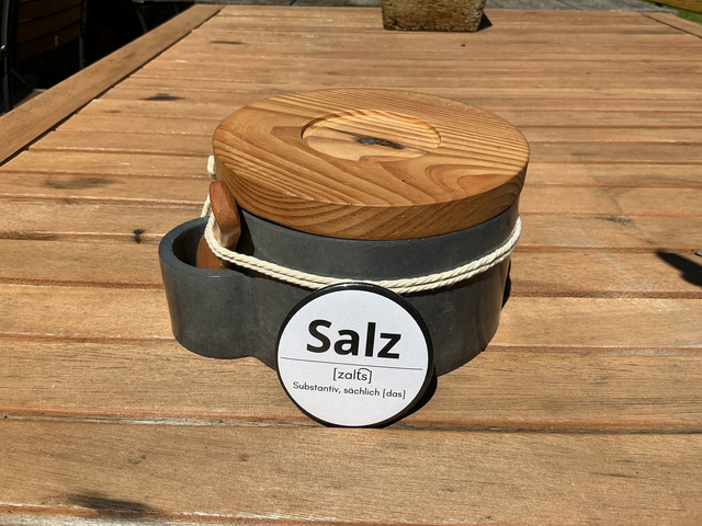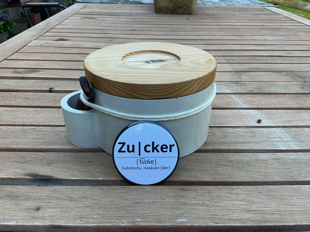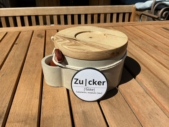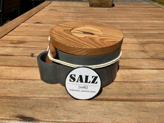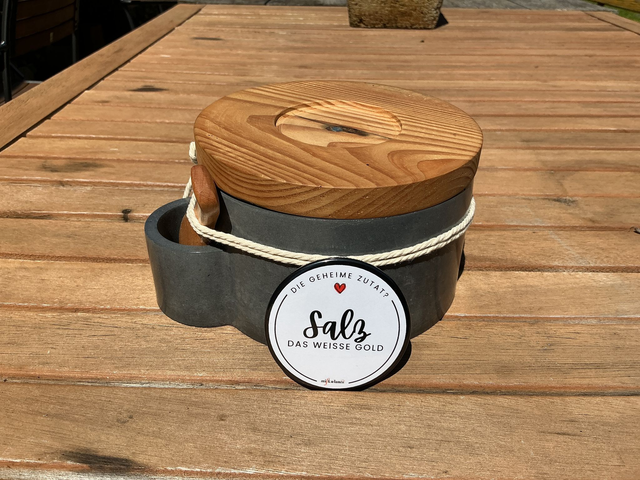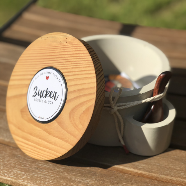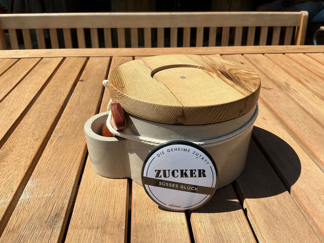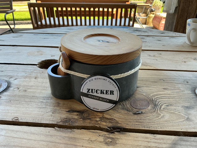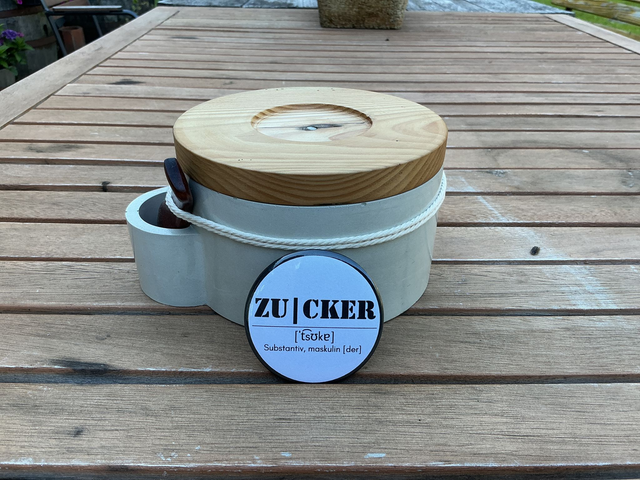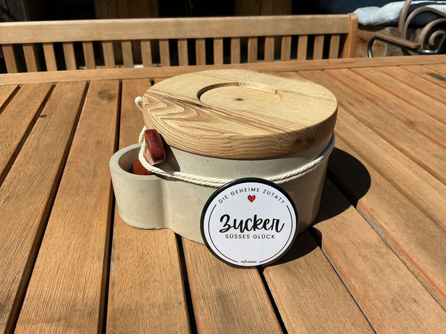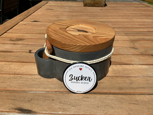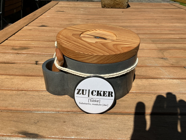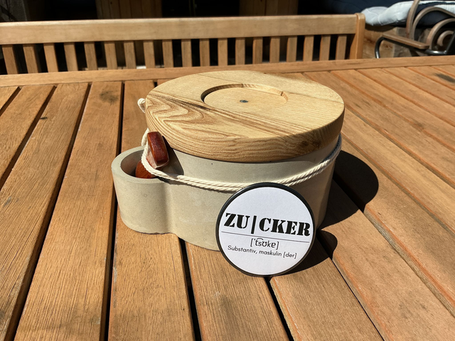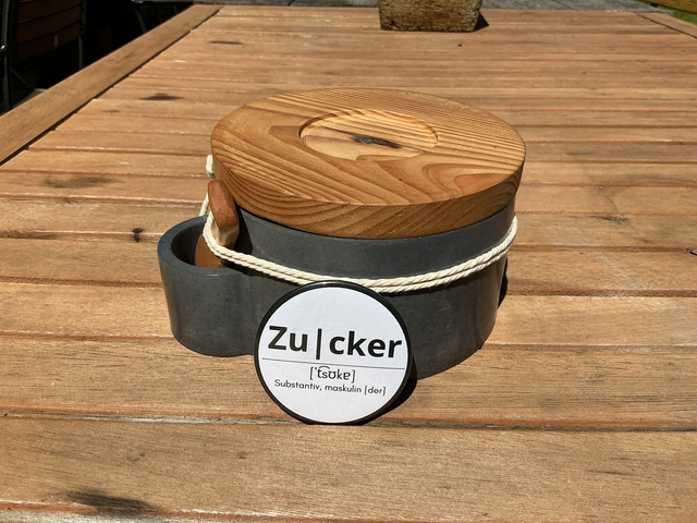 Für den Behälter verwenden wir einen hochwertigen Design-Beton, der durch eine spezielle Oberflächenbehandlung lebensmittelecht (für Lebensmittel geeignet) und schmutzabweisend versiegelt wurde.
