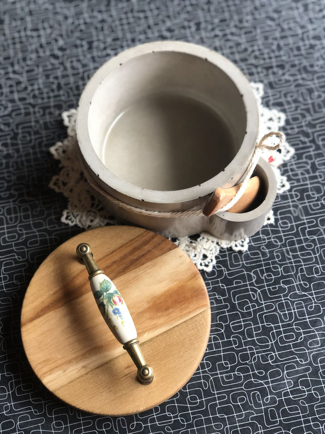 Minimalistisch, robust und nachhaltig: Unser Salz/ Zuckertopf kombiniert einen schlichten Betonbehälter mit einem Deckel aus recyceltem Altholz. Jeder Griff ist ein Unikat - Farben, Maserung & Gebrauchspuren variieren & erzählen eine Gesichte. Handgefertigt, ressourcenschonend. Ein einzigartiges Küchenaccessoire für alle, die Wert auf Nachhaltigkeit, Handwerk und ästhetische Klarheit legen.
